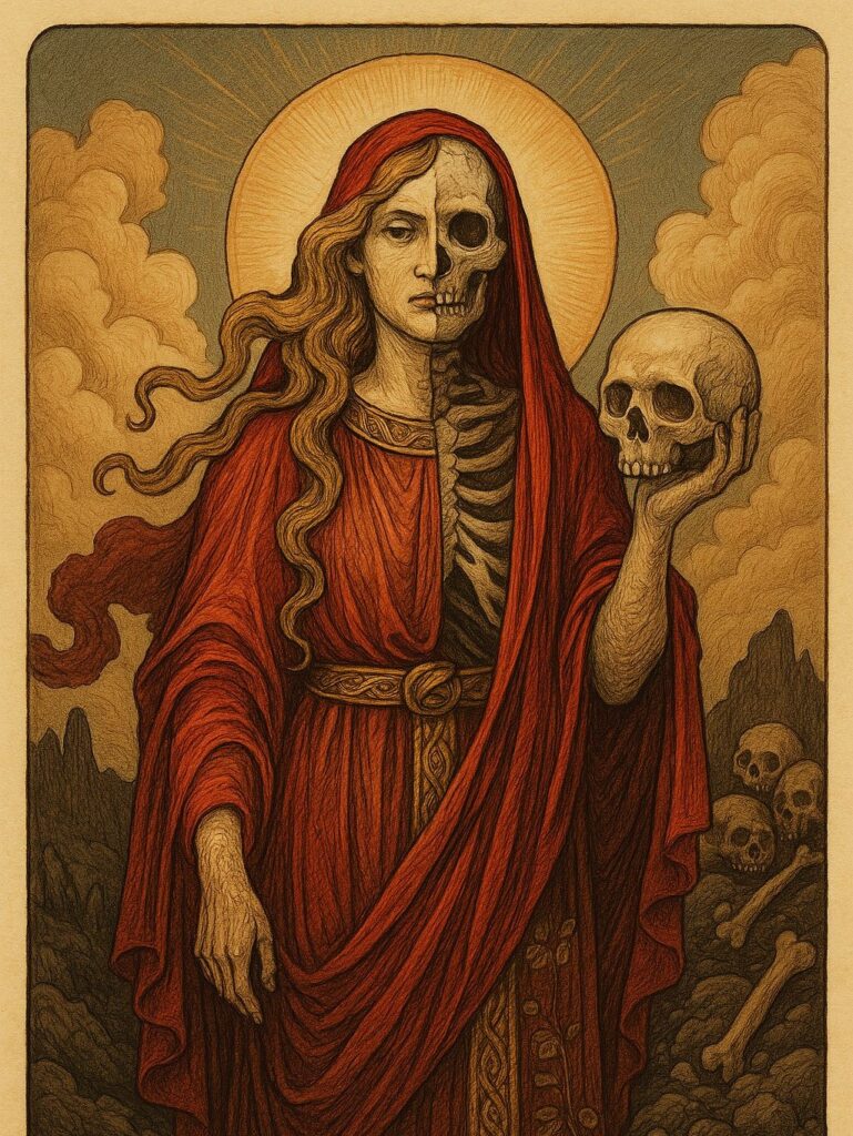 Hel regeert over Helheim, het rijk van degenen die niet sterven op het slagveld. Haar verschijning is half levend, half dood, en haar aanwezigheid straalt een serene maar ijzige autoriteit uit. Hel vertegenwoordigt het onvermijdelijke einde en de balans die nodig is voor het voortbestaan van de kosmos. Haar rijk is stil, kil en onverzettelijk, een plek waar orde heerst over de dood en het onvermijdelijke lot van ieder sterfelijk wezen.
