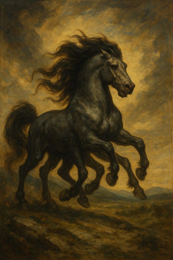 Sleipnir is een magisch achtbenig paard, geboren uit Loki, dat sneller dan de wind beweegt en tussen de werelden reist. Zijn kracht en snelheid symboliseren de verbinding tussen het sterfelijke en het goddelijke, een wezen dat grenzeloos door de kosmos kan bewegen. Sleipnir weerspiegelt de mobiliteit en flexibiliteit van goddelijke macht en laat zien hoe sommige krachten het begrip van tijd en ruimte overstijgen.